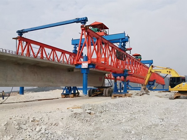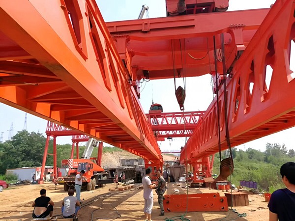 两根主梁当 “轨道”,天车吊梁往前送,整机自己 “走” 过孔。